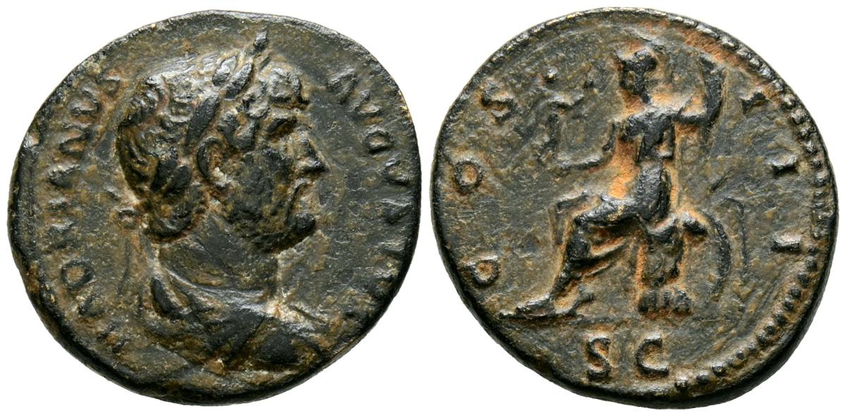 ADRIANO. Semis. (Ae. 4,37g/20mm). 125-127 d.C. Roma. (RIC 685). Anv: Busto laureado y drapeado de Adriano a derecha, alrededor leyenda: HADRIANVS AVGVSTVS. Rev: Roma sentada sobre coraza a izquierda portando Victoria con corona de laurel y lanza, detrás escudo, en exergo: SC, alrededor leyenda: COS III. MBC.