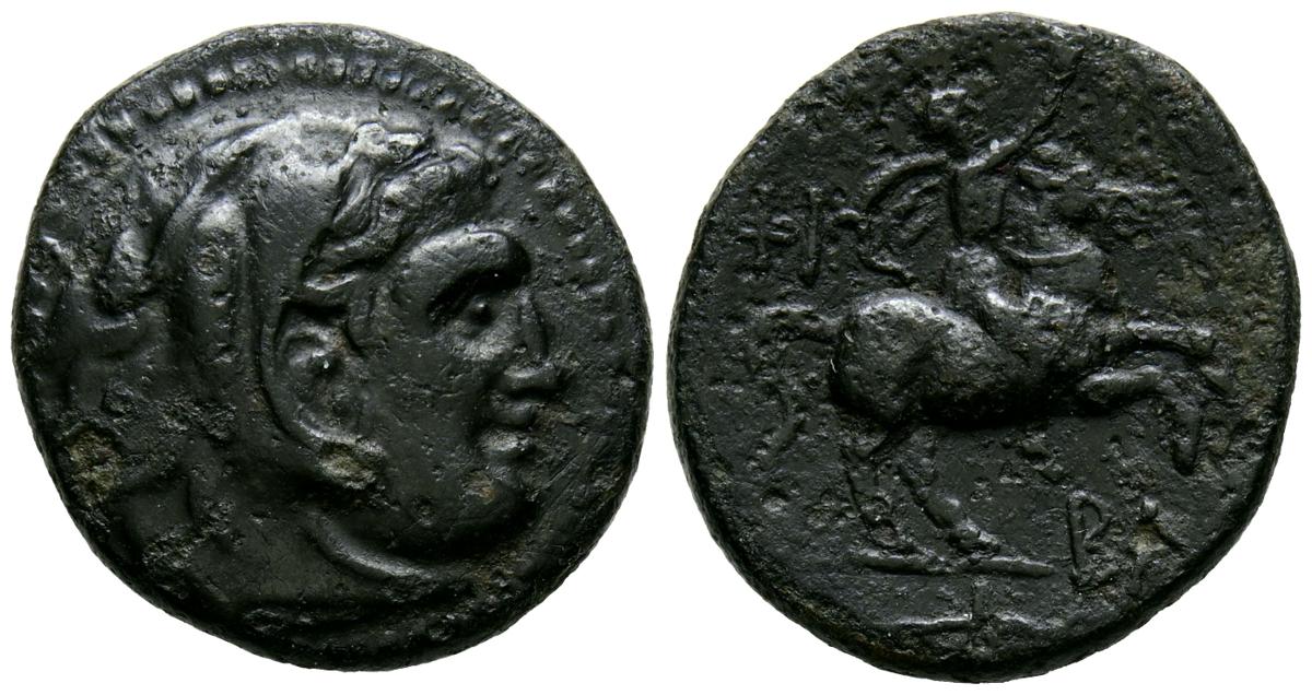 REYES DE MACEDONIA, Filipo III Arrhidaeus. Ae19. (Ae. 5,74g/19mm). 323-317 a.C. Ceca incierta. (Price 126). Anv: Cabeza de heracles con piel de león a derecha. Rev: Jinete sobre caballo a derecha, detrás y debajo monogramas griegos. MBC.