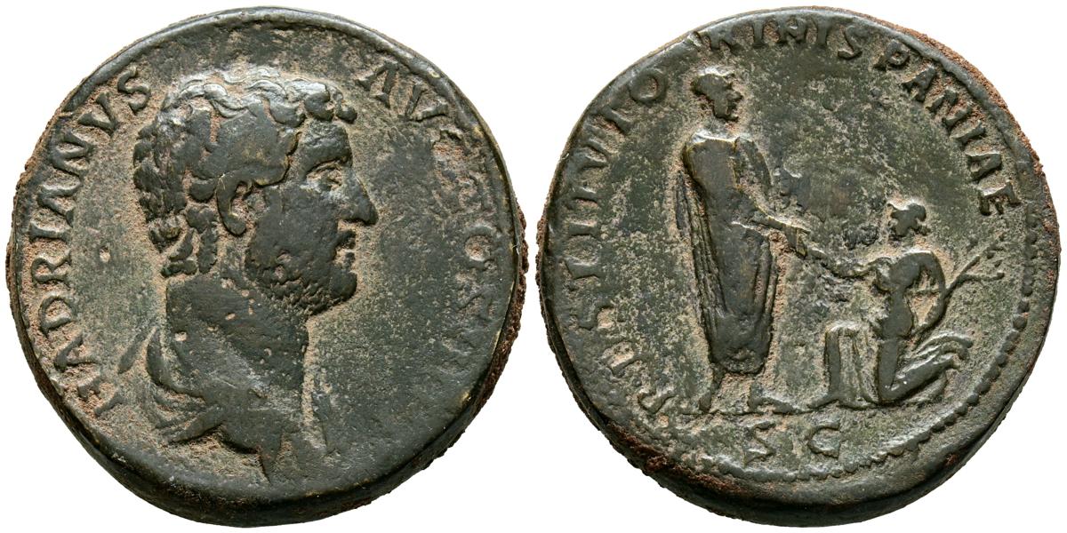 ADRIANO. Sestercio. (Ae. 27,92g/32mm). 130-133 d.C. Roma. (RIC 1865var). Anv: Busto drapeado de Adriano a derecha, alrededor leyenda: HADRIANVS AVG COS III P P. Rev: Adriano estante a derecha portando libro y dando la mano a Hispania arrodillada a izquierda, en exergo: SC, alrededor leyenda: RESTITVTORI IHSPANIAE. MBC. Escaso.