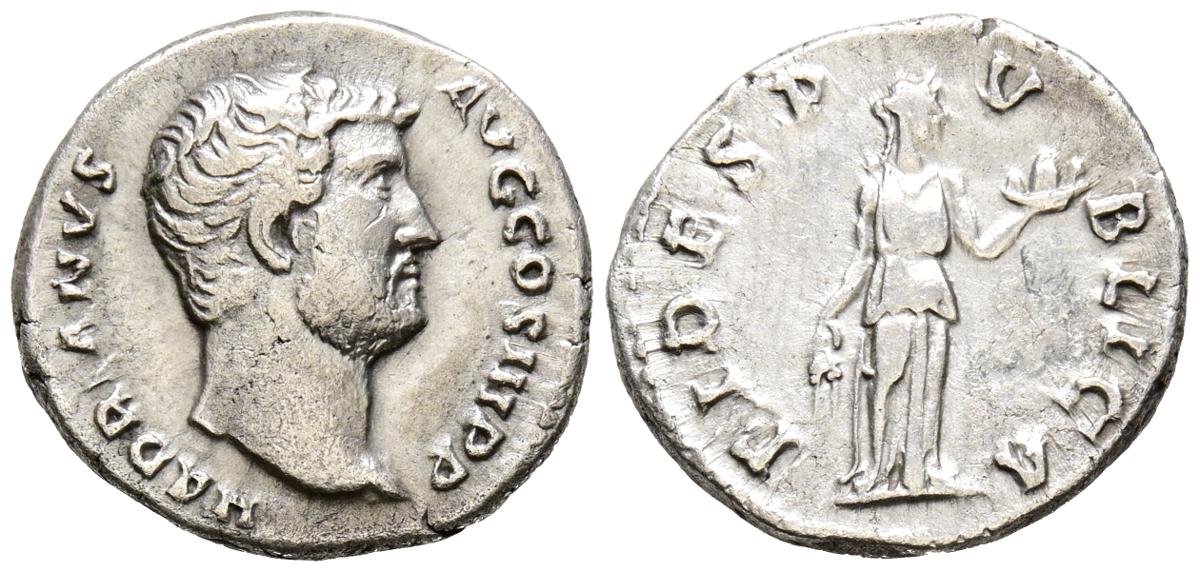 ADRIANO. Denario. (Ar. 3,50g/17mm). 136 d.C. Roma. (RIC 241Aa). Anv: Cabeza de Adriano a derecha, alrededor leyenda: HADRIANVS AVG COS III P P. Rev: Fides estante a derecha portando granos y plato de frutas, alrededor leyenda: FIDES PVBLICA. MBC.
