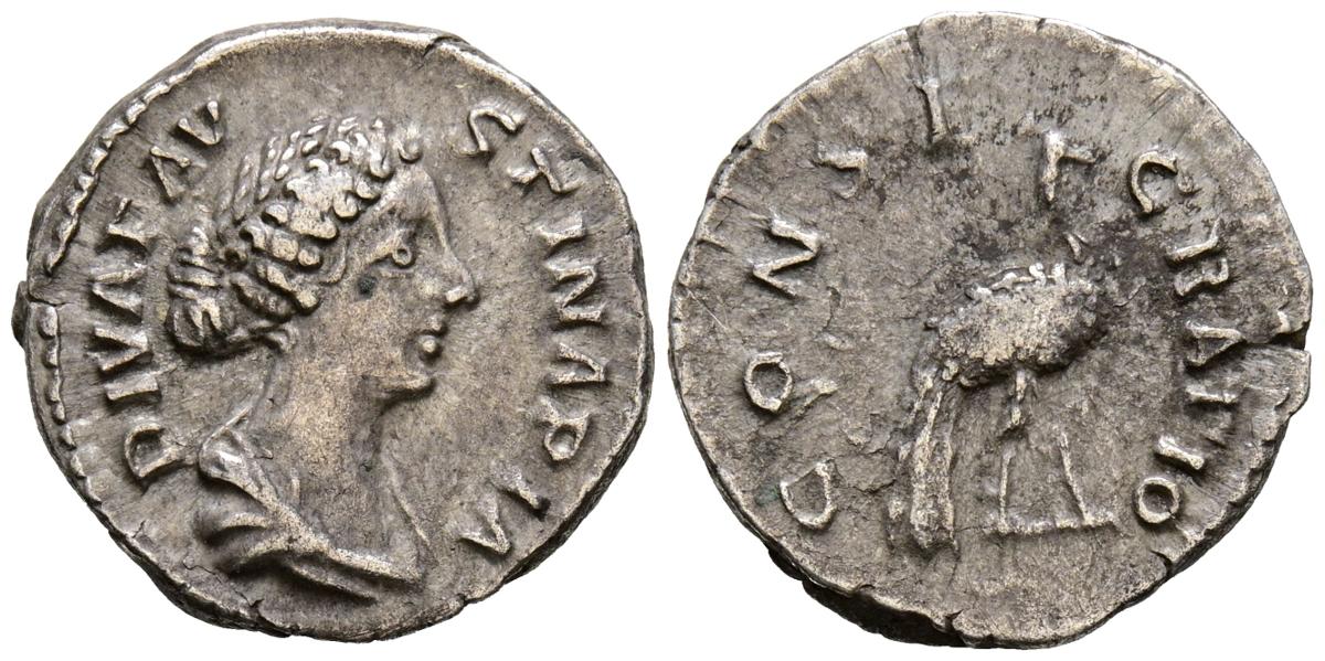 FAUSTINA II. Denario. (Ar. 2,92g/18mm). 176-180 d.C. Roma. (RIC 744). Anv: Busto drapeado de Faustina II a derecha, alrededor leyenda: DIVA FAVSTINA PIA. Rev: Pavo real a derecha, alrededor leyenda: CONSECRATIO. MBC/MBC-.