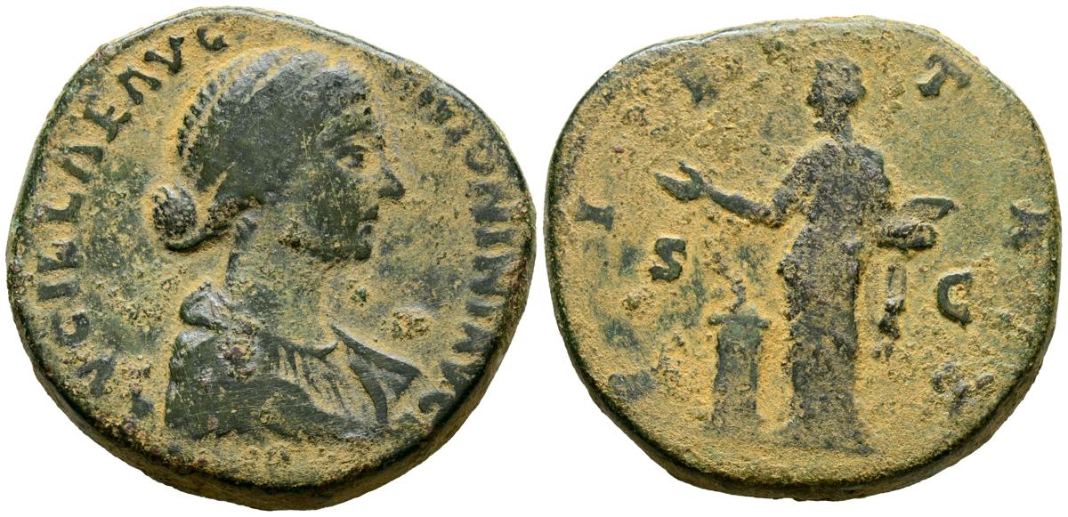 LUCILLA. Sestercio. (Ae. 20,73g/30mm). 161-162 d.C. Roma. (RIC 1756). Anv: Busto drapeado y diademado de Lucilla a derecha, alrededor leyenda: LVCILLAE AVG ANTONINI AVG F. Rev: Vesta estante a izquierda portando acerrum y tirando incienso sobre altar, entre S-C, alrededor leyenda: PIETAS. MBC-.