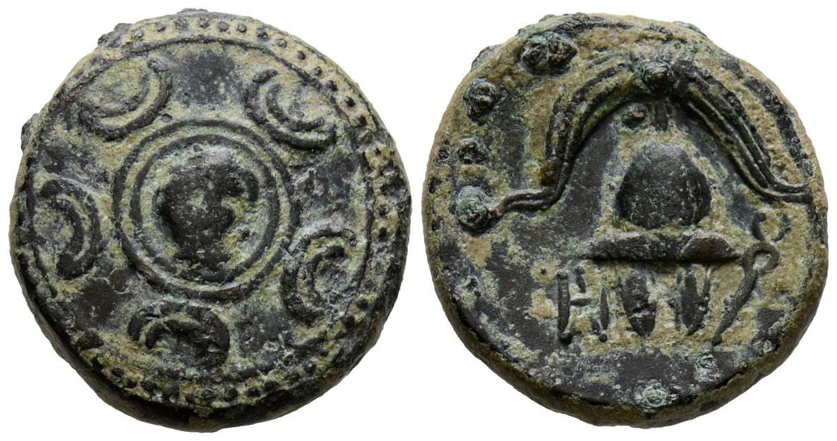 REYES DE MACEDONIA, Filipo III Arrhidaios. Ae16. (Ae. 4,04g/16mm). 323-317 a.C. Ceca incierta del oeste de Asia. (Price 2803). Anv: Cabeza de Heracles con piel de león a derecha dentro de escudo macedonio. Rev: Casco macedonio, a la izquierda monograma griego, a la derecha caduceo. MBC.