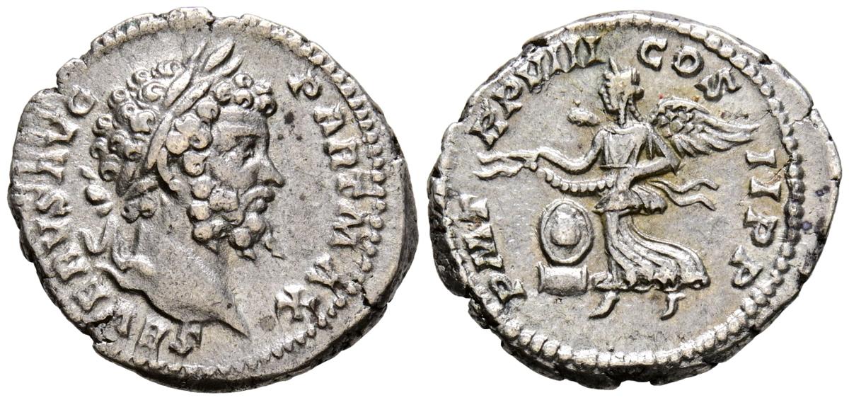 SEPTIMIO SEVERO. Denario. (Ar. 3,36g/19mm). 200 d.C. Roma. (RIC 150). Anv: Cabeza laureada de Septimio Severo a derecha, alrededor leyenda: SEVERVS AVG PART MAX. Rev: Victoria avanzando a izquierda portando escudo, alrededor leyenda: P M TR P VIII COS II P P. MBC+.