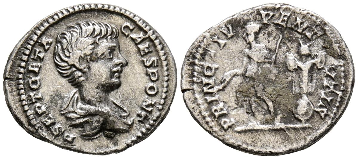 GETA. Denario. (Ar. 2,90g/20mm). 200-202 d.C. Roma. (RIC 18). Anv: Busto drapeado de Geta a derecha, alrededor leyenda: P SEPT GETA CAES PONT. Rev: Geta estante a izquierda portando cetro y vara, detrás trofeo de armas, alrededor leyenda: PRINC IVVENTVTIS. MBC-.