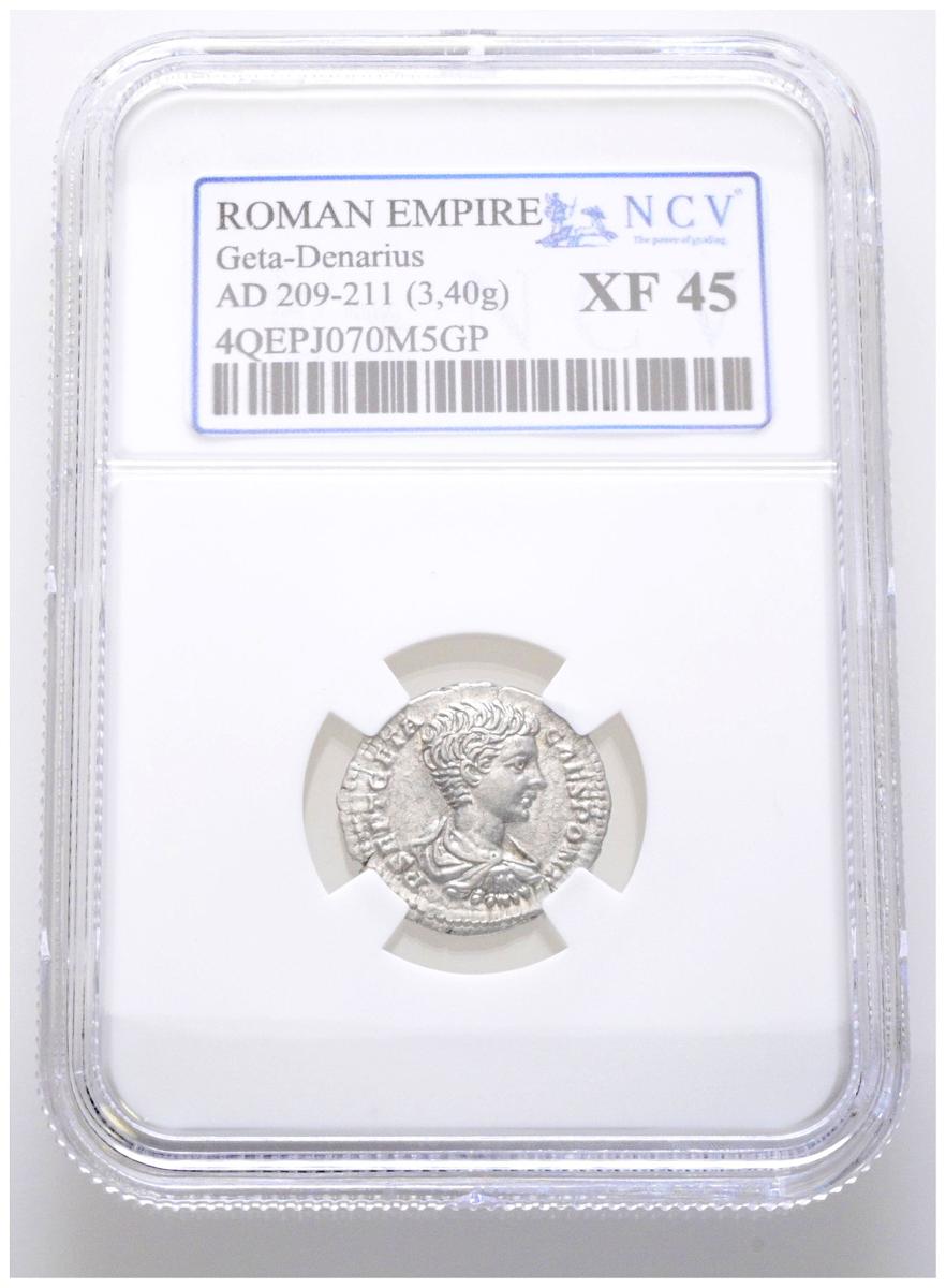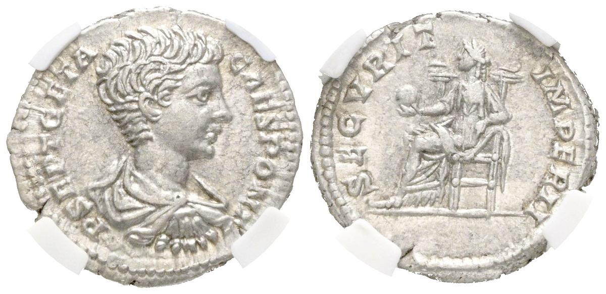 GETA. Denario. (Ar. 2,91g/18mm). 200-202 d.C. Roma. (RIC 20b). Anv: Busto drapeado de Geta a derecha, alrededor leyenda: P SEPT GETA CAES PONT. Rev: Securitas sentada a izquierda portando globo, alrededor leyenda: SECVRIT IMPERII. Encapsulado por NCV XF45.