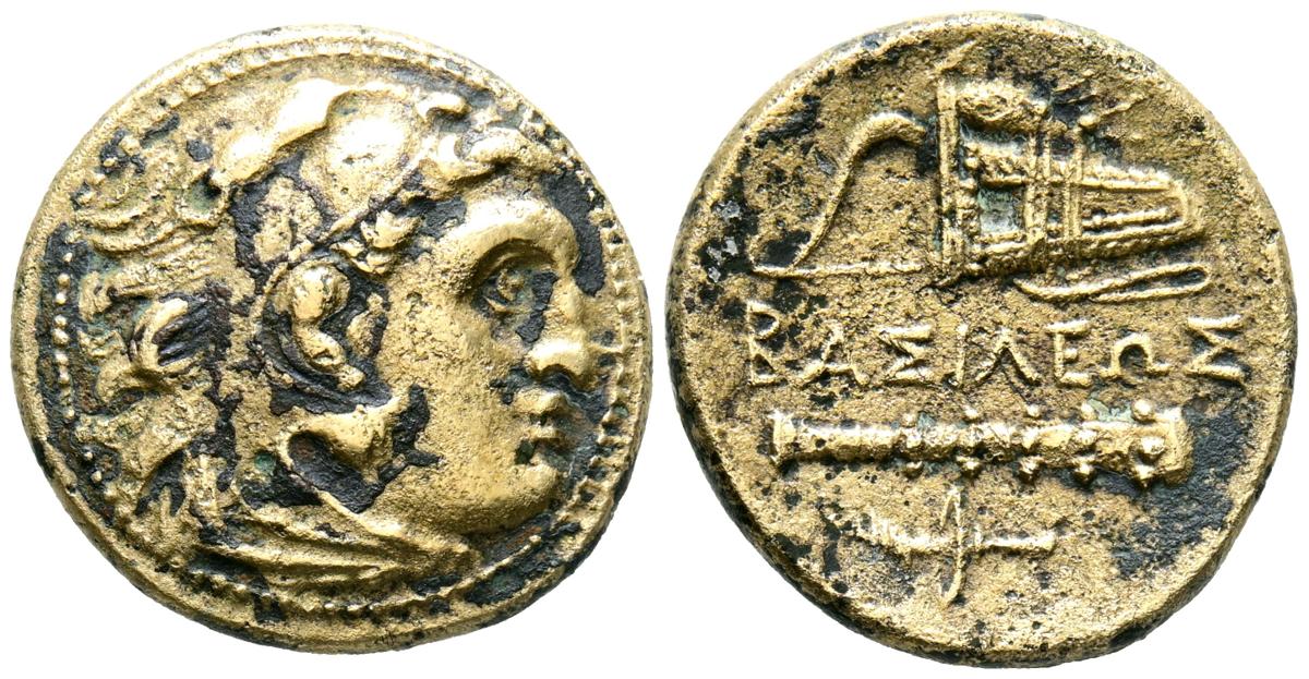 REYES DE MACEDONIA, tiempos entre Filipo III y Antigonos I Monophthalmos. Ae21. (Ae. 5,87g/21mm). 323-310 a.C. (Price 2800). Anv: Cabeza de heracles con piel de león a derecha. Rev: Leyenda griega entre arco con carcaj y mazo y daga. MBC-. Limpiado.
