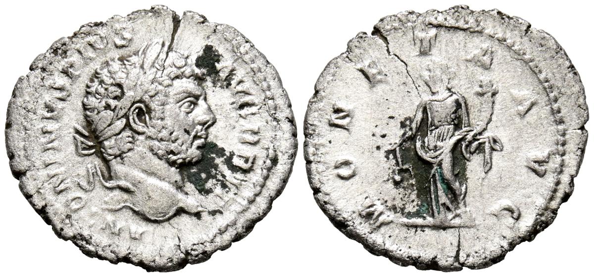 CARACALLA. Denario. (Ar. 2,35g/21mm). 210-213 d.C. Roma. (RIC 224). Anv: Cabeza laureada de Caracalla a derecha, alrededor leyenda: ANTONINVS PIVS AVG BRIT. Rev: Moneta estante a izquierda portando escalas y cornucopia, alrededor leyenda: MONETA AVG. MBC. Grietas.