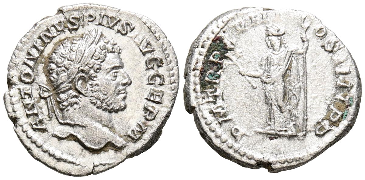 CARACALLA. Denario. (Ar. 3,07g/19mm). 215 d.C. Roma. (RIC 268). Anv: Cabeza laureada de Caracalla a derecha, alrededor leyenda: ANTONINVS PIVS AVG GERM. Rev: Pax estante a izquierda portando lanza y rama, alrededor leyenda: P M TR P XVIII COS IIII P P. MBC.