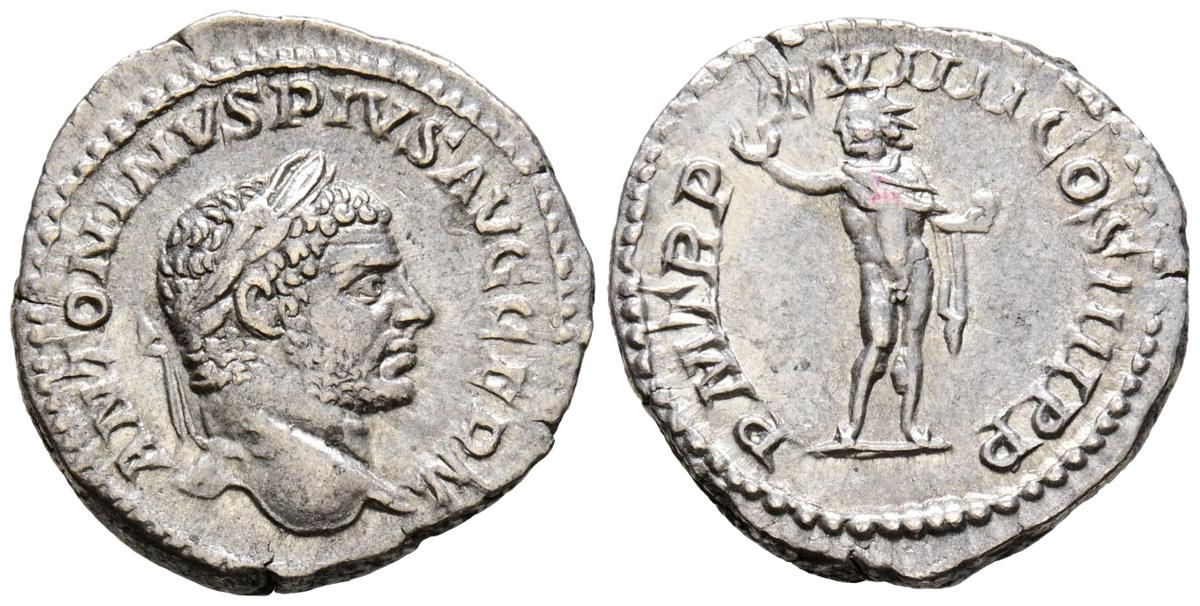 CARACALLA. Denario. (Ar. 3,03g/19mm). 216 d.C. Roma. (RIC 281b). Anv: Cabeza laureada de Caracalla a derecha, alrededor leyenda: ANTONINVS PIVS AVG GERM. Rev: Sol estante a izquierda alzando mano derecha y portando globo, alrededor leyenda: P M TR P XVIIII COS IIII P P. MBC+.