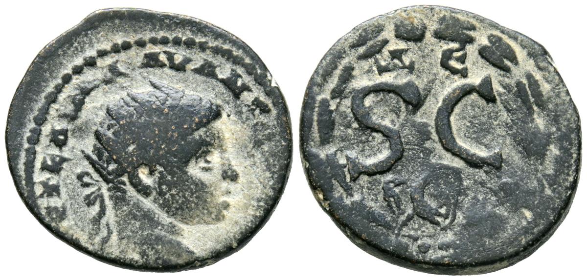 HELIOGABALO. Ae18. (Ae. 4,60g/20mm). 218-222 d.C. Seleucis y Pieria. (McAlee 782-783). Anv: Cabeza laureada de Heliogábalo a derecha, alrededor leyenda. Rev: SC, encima AE, debajo águila, todo dentro de corona de laurel. MBC.