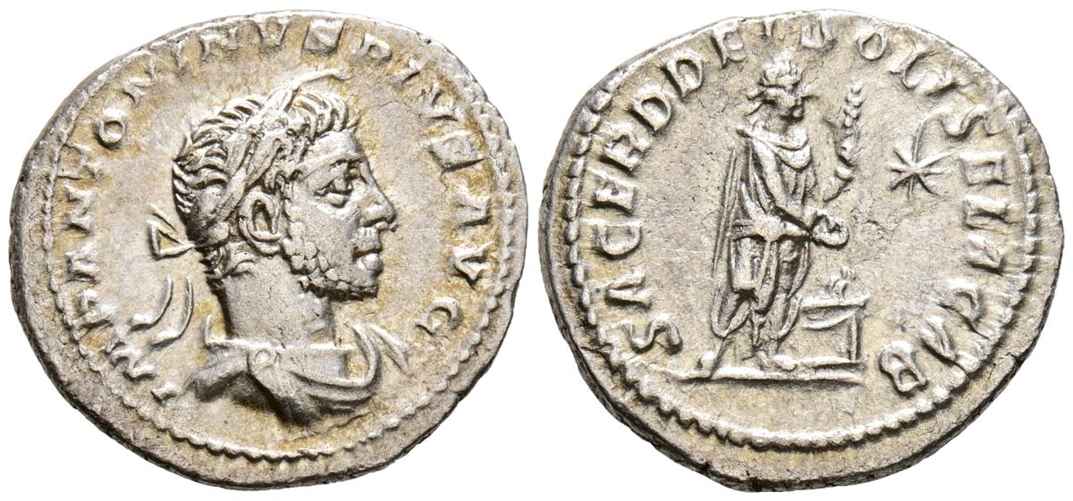 HELIOGABALO. Denario. (Ar. 2,92g/20mm). 221-222 d.C. Roma. (RIC 131). Anv: Busto laureado, drapeado y con coraza de Heliogábalo a derecha, alrededor leyenda: IMP ANTONINVS PIVS AVG. Rev: Heliogábalo estante a derecha portando patera y palma sobre altar, en campo estrella, alrededor leyenda: SACERD DEI SOLIS ELAGABAL. MBC+/MBC.
