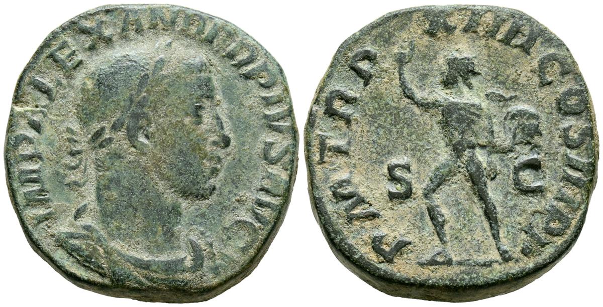 ALEJANDRO SEVERO. Sestercio. (Ae. 22,37g/29mm). 233 d.C. Roma. (RIC 541). Anv: Busto laureado y con coraza de Alejandro Severo a derecha, alrededor leyenda: IMP ALEXANDER PIVS AVG. Rev: Sol avanzando a izquierda portando látigo y alzando mano derecha, entre S-C, alrededor leyenda: P M TR P XIIII COS III P P. MBC-.