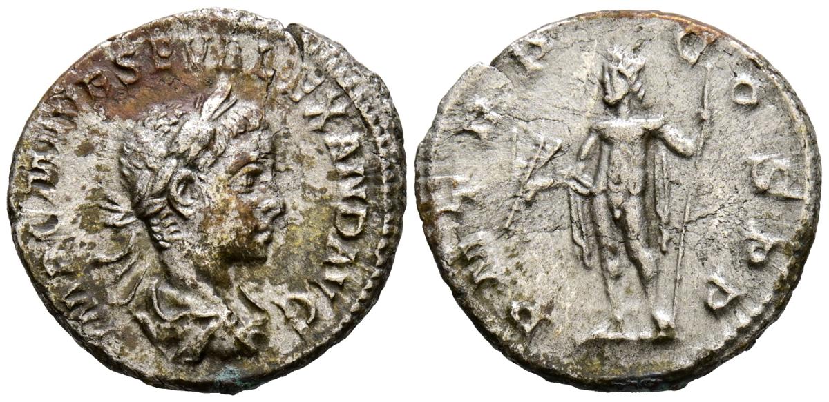 ALEJANDRO SEVERO. Denario. (Ar. 2,94g/19mm). 223 d.C. Roma. (RIC 19). Anv: Busto laureado y drapeado de Alejandro Severo a derecha, alrededor leyenda: IMP C M AVR SEV ALEXAND AVG. Rev: Júpiter estante a izquierda portando lanza y rayo, alrededor leyenda: P M TR P II COS P P. MBC-. Oxidaciones.