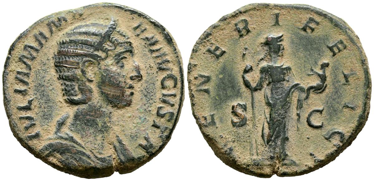 JULIA MAMAEA. Sestercio. (Ae. 13,58g/29mm). 222-235 d.C. Roma. (RIC 694). Anv: IVLIA MAMAEA AVGVSTA. Busto diademado y drapeado a derecha de Julia Mamaea. Rev: VENERI FELICI. Felicitas estante a derecha portando cetro y Victoria, entre S-C. MBC.