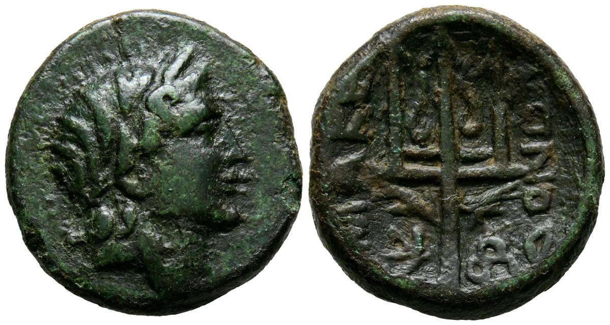 REINO DE MACEDONIA. Ae21. (Ae. 6,27g/21mm). 168 a.C. (HGC 3.1, 334). Anv. Cabeza laureada de Strymon a derecha. Rev: Tridente entre monogramas, alrededor leyenda griega. MBC-.