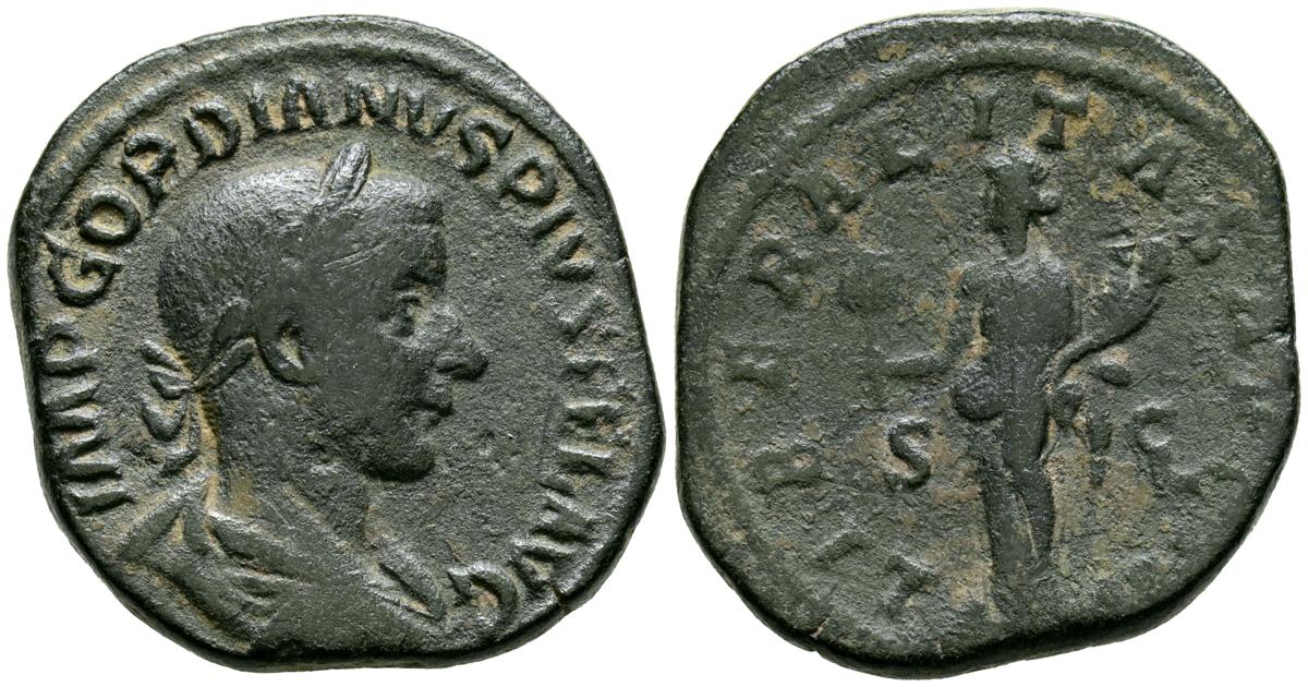 GORDIANO III. Sestercio. (Ae. 17,71g/32mm). 240 d.C. Roma. (RIC 318a). Anv: Busto laureado y drapeado de Gordiano III a derecha, alrededor leyenda: IMP GORDIANVS PIVS FEL AVG. Rev: Libertas estante a izquierda portando pileo y cetro, entre: S-C, alrededor leyenda: LIBERTAS AVG. MBC-.