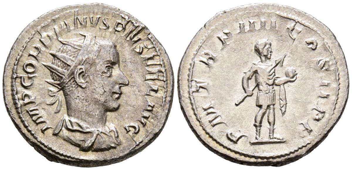 GORDIANO III. Antoniniano. (Ar. 3,54g/23mm). 241-243 d.C. Roma. (RIC 9). Anv: Busto drapeado y radiado de Gordiano III a derecha, alrededor leyenda: IMP GORDIANVS PIVS FEL AVG. Rev: Gordiano III estante a derecha con atuendo militar portando lanza y globo, alrededor leyenda: P M TR P IIII COS II P P. MBC+.