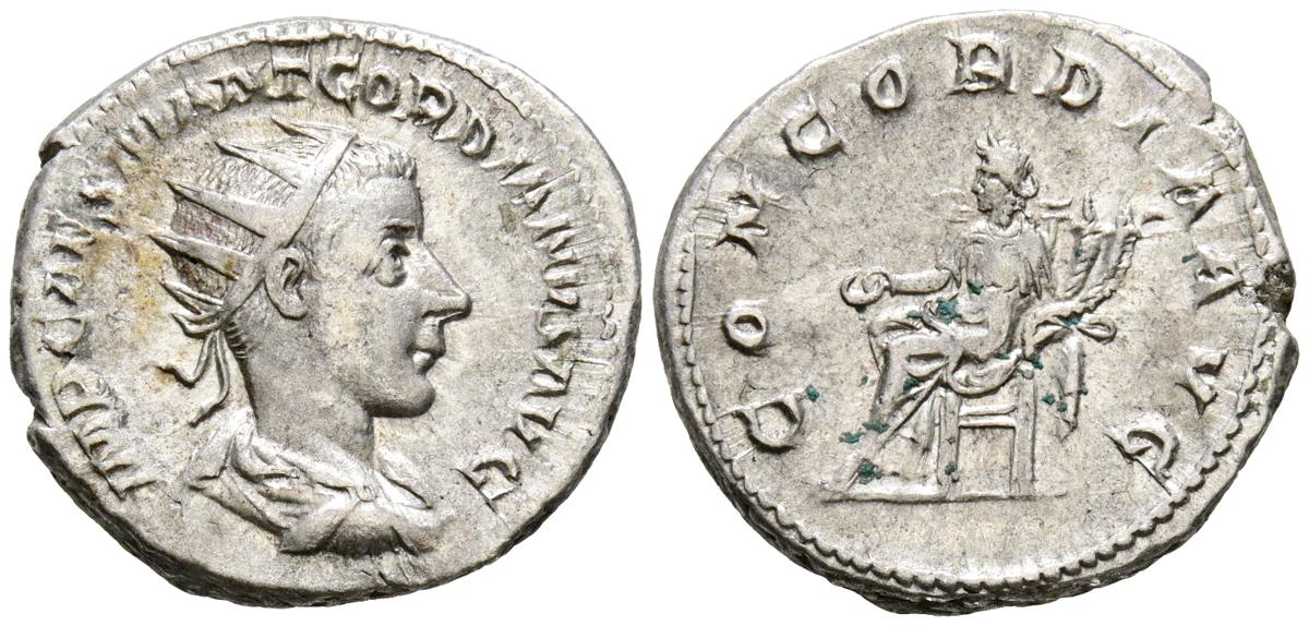 GORDIANO III. Antoniniano. (Ar. 4,79g/21mm). 240 d.C. Roma. (RIC 35). Anv: Busto radiado y drapeado de Gordiano III a derecha, alrededor leyenda: IMP CAES M ANT GORDIANVS AVG. Rev: Concordia sentada a izquierda portando patera y cornucopia, alrededor leyenda: CONCORDIA AVG. MBC+.