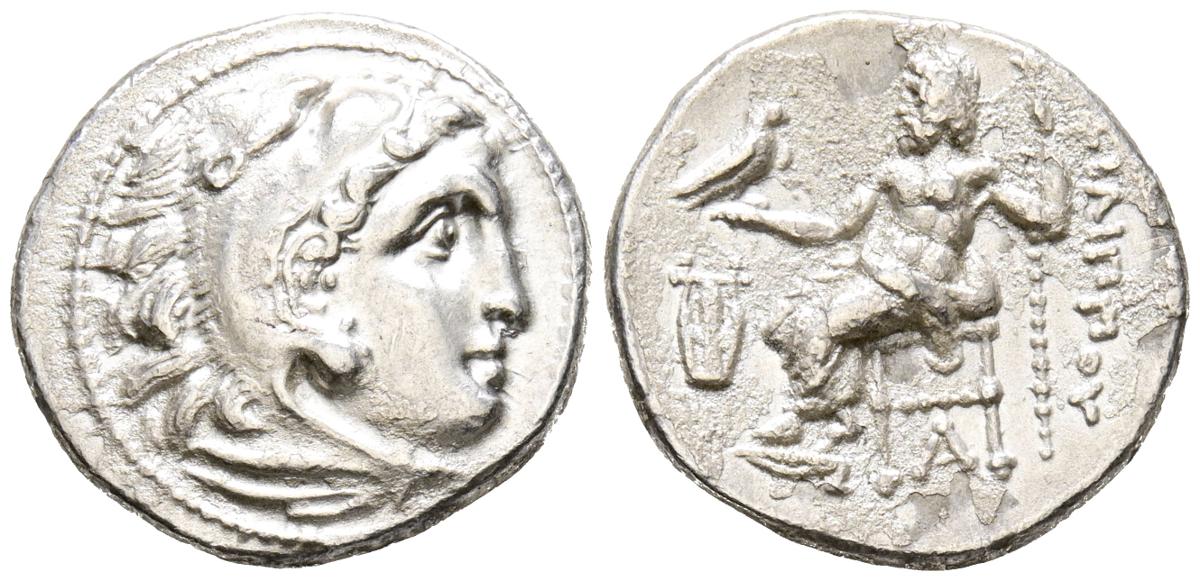 REINO DE MACEDONIA, Alejandro III el Grande. Dracma. (Ar. 4,21g/18mm). 323-319 a.C. Kolophon. (Price 1769). Anv: Cabeza de Heracles con piel de león a derecha. Rev: Zeus sentado a izquierda portando águila y cetro, delante lira y debajo del trono A, detrás leyenda griega. MBC+/MBC. Oxidaciones limpiadas en reverso.