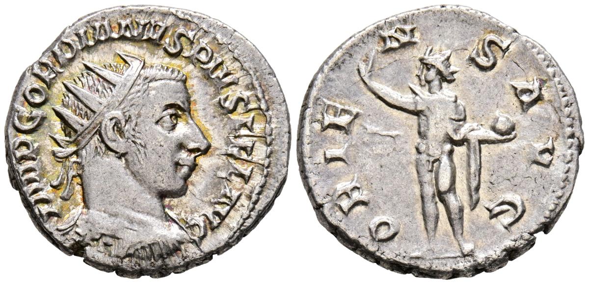 GORDIANO III. Antoniniano. (Ar. 4,95g/22mm). 242-244 d.C. Antioquía. (RIC 213). Anv: Busto radiado y drapeado de Gordiano III a derecha, alrededor leyenda: IMP GORDIANVS PIVS FEL AVG. Rev: Sol radiado estante a izquierda portando globo y alzando mano derecha, alrededor leyenda: ORIENS AVG. MBC+.