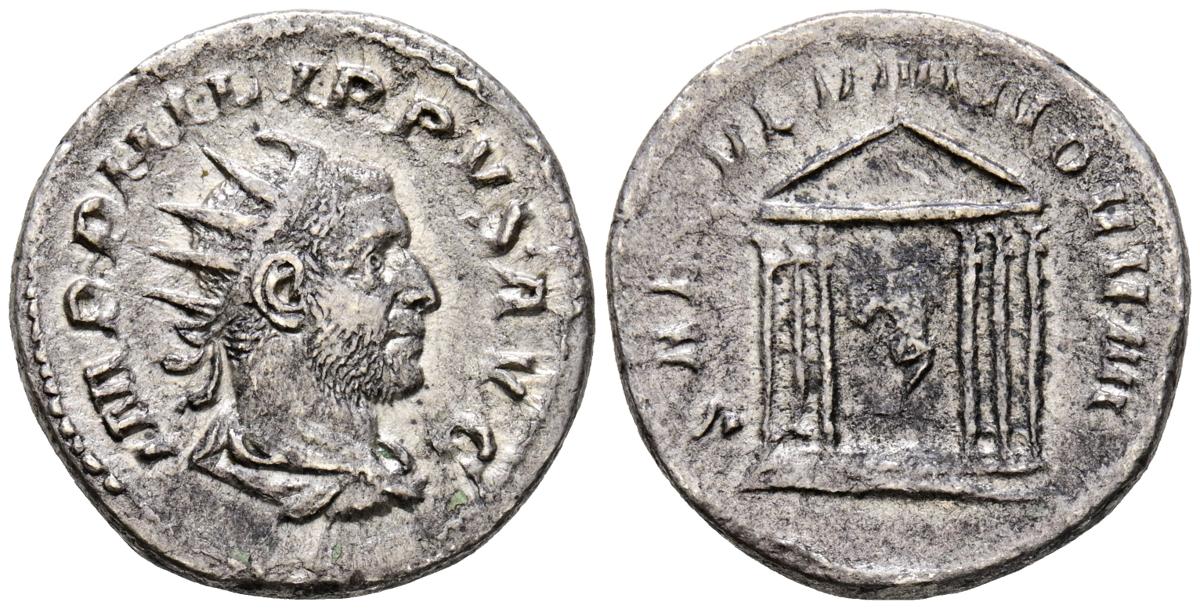 FILIPO I. Antoniniano. (Ar. 4,37g/22mm). 249 d.C. Roma. (RIC 25b). Anv: Busto radiado y drapeado de Filipo I a derecha, alrededor leyenda: IMP PHILIPPVS AVG. Rev: Templo hexástilo con estatua de Roma dentro, alrededor leyenda: SAECVLVM NOVVM. MBC+.