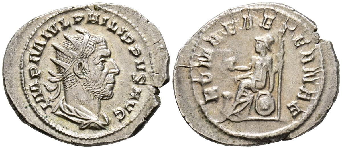 FILIPO I. Antoniniano. (Ar. 4,26g/25mm). 245-247 d.C. Roma. (RIC 44b). Anv: Busto radiado y drapeado de Filipo I a derecha, alrededor leyenda: IMP M IVL PHILIPPVS AVG. Rev: Roma portando Victoria con corona de laurel y lanza, sentada sobre escudo a izquierda, alrededor leyenda: ROMAE AETERNAE. MBC+/MBC.