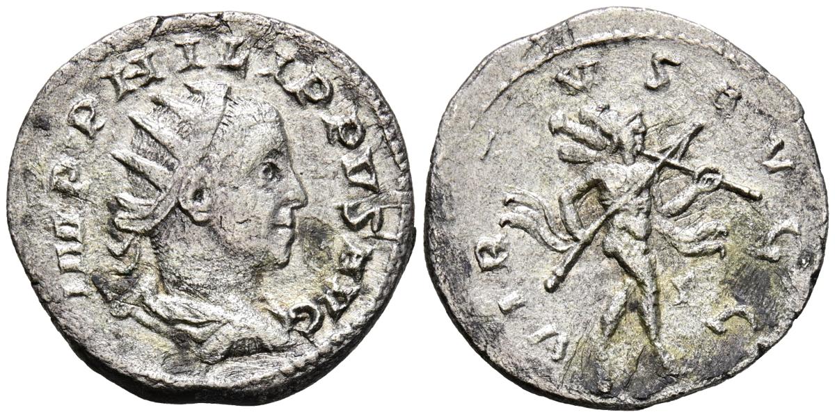 FILIPO II. Antoniniano. (Ar. 2,95g/22mm). 248 d.C. Roma. (RIC 223). Anv: Busto radiado y drapeado de Filipo II a derecha, alrededor leyenda: IMP PHILIPPVS AVG. Rev: Rev: Virtus avanzando a derecha portando lanza y trofeo, alrededor leyenda: VIRTVS AVGG. MBC-.