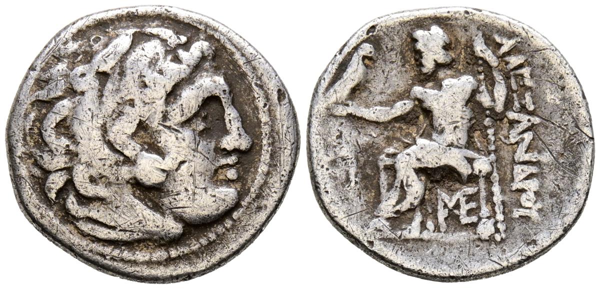 REYES DE MACEDONIA, Antigonos I Monophthalmos. Dracma. (Ar. 4,04g/19mm). 310-301 a.C. Lampsakos. (Price 1417). Anv: Cabeza de Heracles con piel de león a derecha. Rev: Zeus sentado a izquierda portando aguila y cetro, delante ánfora, debajo del trono: ME, detrás leyenda griega. MBC-.