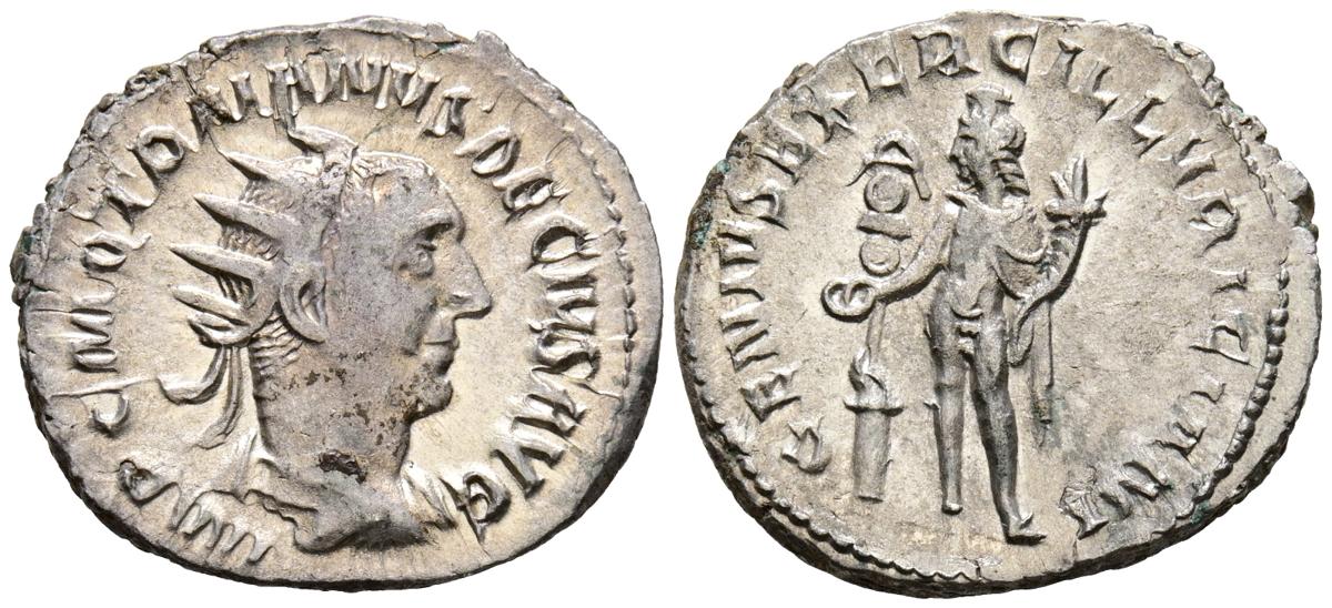 TRAJANO DECIO. Antoniniano. (Ar. 3,66g/22mm). 249-251 d.C. Roma. (RIC 16c). Anv: Busto radiado y drapeado de Trajano Decio a derecha, alrededor leyenda: IMP C M Q TRAIANVS DECIVS AVG. Rev: Genio estante a izquierda portando patera y cornucopia, detrás estandarte, alrededor leyenda: GENIVS EXERC ILLVRICIANI. MBC+.