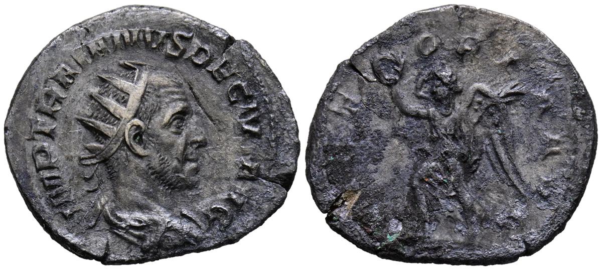 TRAJANO DECIO. Antoniniano. (Ar. 2,97g/24mm). 249-251 d.C. Roma. (RIC 29c var). Anv: Busto radiado y drapeado de Trajano Decio a derecha, alrededor leyenda: IMP TRAIANVS DECIVS AVG. Rev: Victoria avanzando a izquierda portando corona de laurel, alrededor leyenda: VICTORIA AVG. MBC-/BC+.