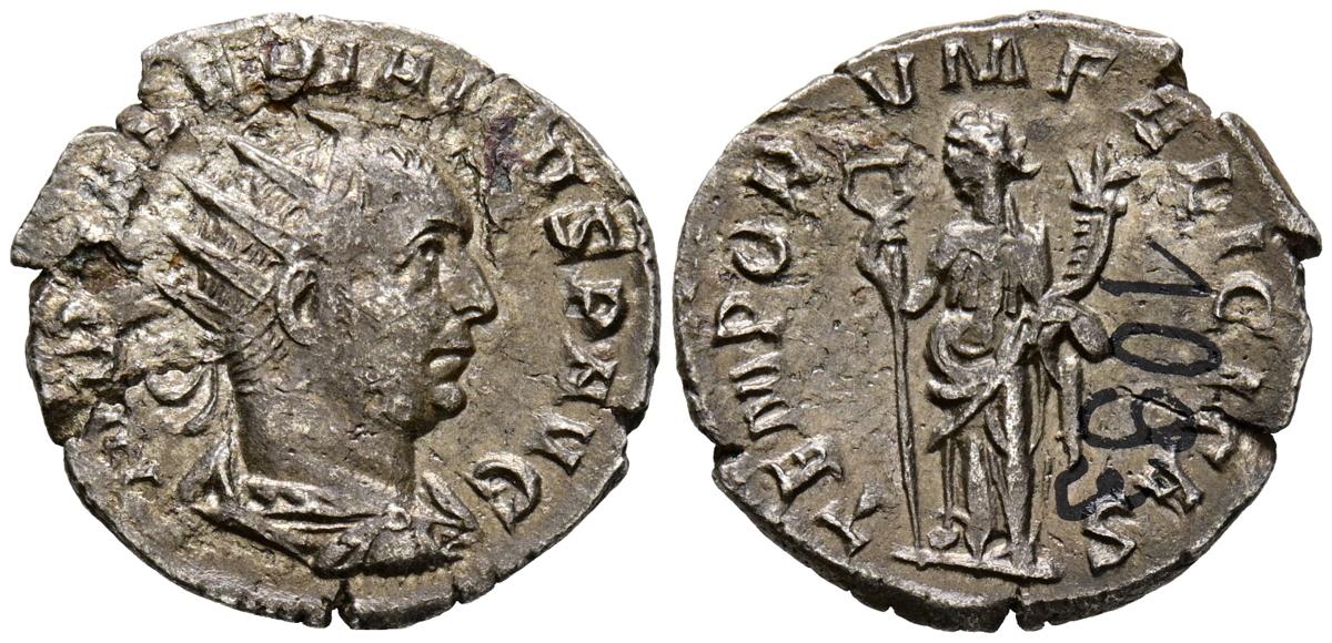 VALERIANO I. Antoniniano. (Ar. 2,28g/21mm). 254-255 d.C. Viminacium. (RIC 259). Anv: Busto radiado y drapeado de Valeriano I a derecha, alrededor leyenda: IMP VALERIANVS P AVG. Rev: Felicitas estante a izquierda portando caduceo y cornucopia, alrededor leyenda: TEMPORVM FELICITAS. MBC. Oxidaciones limpiadas. Número en tinta de colección.