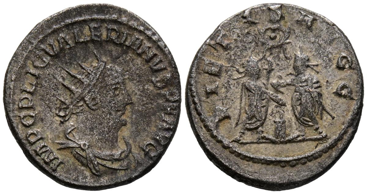 VALERIANO I. Antoniniano. (Ar. 3,99g/21mm). 255-256 d.C. Samosata. (RIC 284). Anv: Busto radiado y drapeado de Valeriano I a derecha, alrededor leyenda: IMP C P LIC VALERIANVS AVG. Rev: Dos emperadores enfrentados portando cetro y patera sobre altar, alrededor leyenda: PIETAS AVGG. MBC.