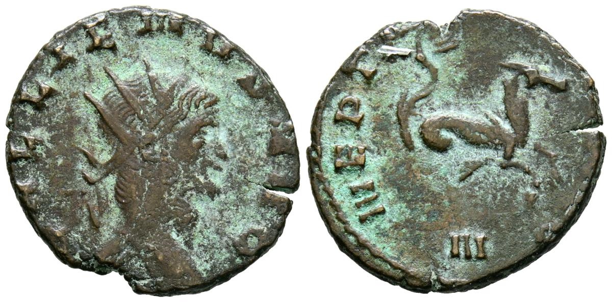 GALIENO. Antoniniano. (Ae. 2,76g/19mm). 260-261 d.C. Roma. (RIC 245 var). Anv: Cabeza radiada de Galieno a derecha, alrededor leyenda: GALLIENVS AVG. Rev: Capricornio a derecha, debajo: III, alrededor leyenda: NEPTVNO CONS AVG. MBC-.