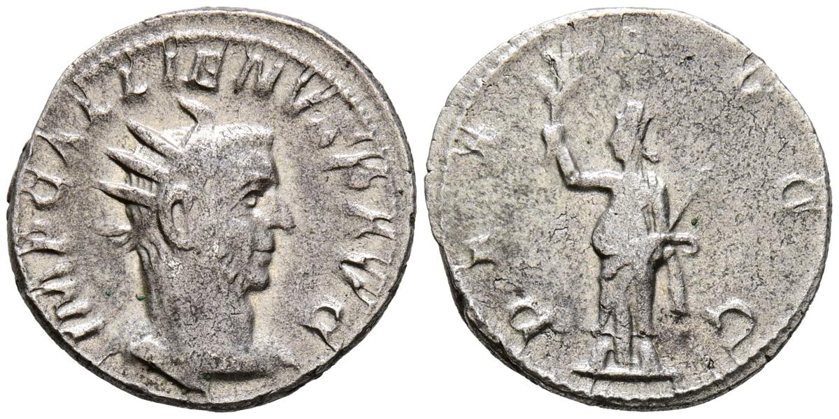 GALIENO. Antoniniano. (Ar. 3,07g/21mm). 254-255 d.C. Viminacium. (RIC 391). Anv: Busto radiado y drapeado de Galieno a derecha, alrededor leyenda: IMP GALLIENVS P AVG. Rev: Pax estante a izquierda portando rama y cetro, alrededor leyenda: PAX AVGG. MBC-.