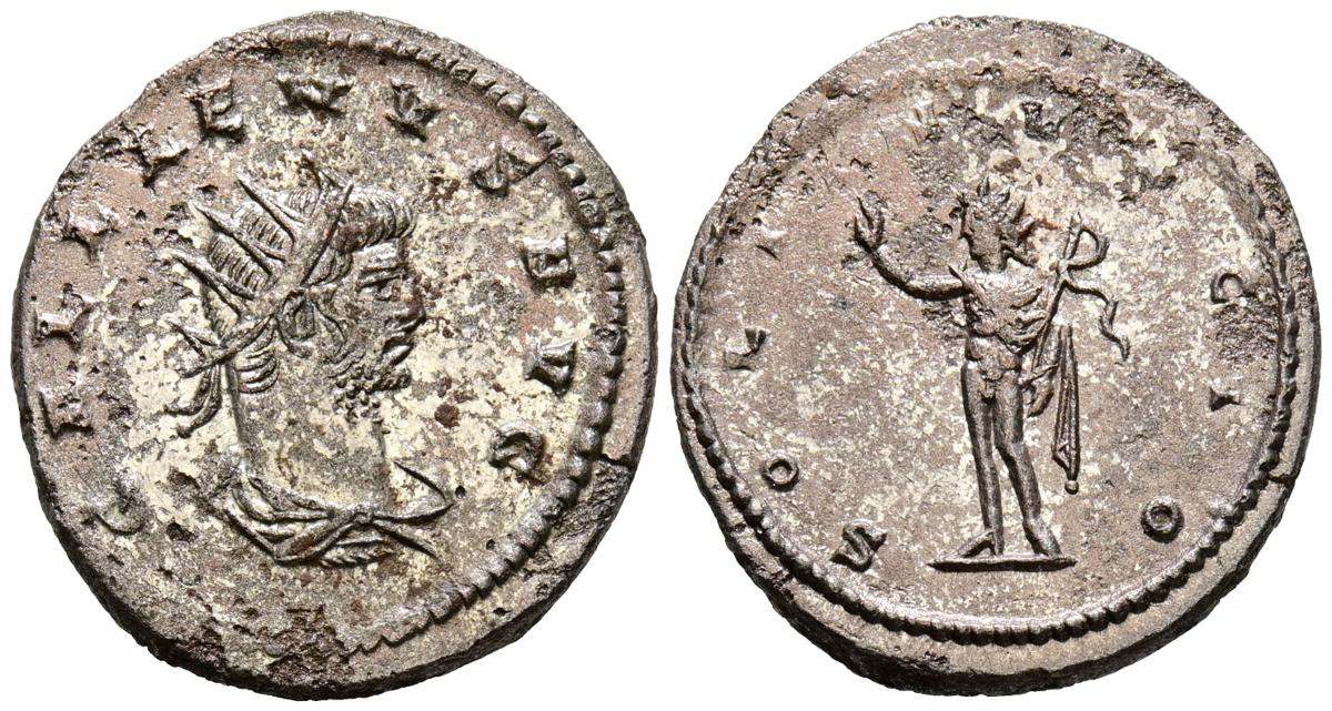GALIENO. Antoniniano. (Ve. 3,28g/22mm). 266-267 d.C. Antioquía. (RIC 660). Anv: Busto radiado y drapeado de Galieno a derecha, alrededor leyenda: GALLIENVS AVG. Rev: Sol estante a izquierda portando látigo y alzando mano derecha, alrededor leyenda: SOL INVICTO. EBC-. Plateado original.