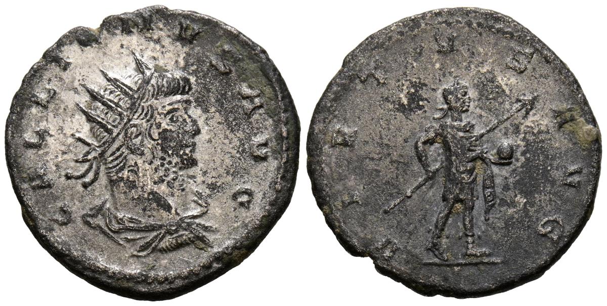 GALIENO. Antoniniano. (Ae. 2,86g/20mm). 264-265 d.C. Antioquía. (RIC 670). Anv: Busto radiado y con coraza de Galieno a derecha, alrededor leyenda: GALLIENVS AVG. Rev: Galieno estante a derecha portando lanza y globo, en exergo palma, alrededor leyenda: VIRTVS AVG. MBC. Ligeros restos de plateado original.