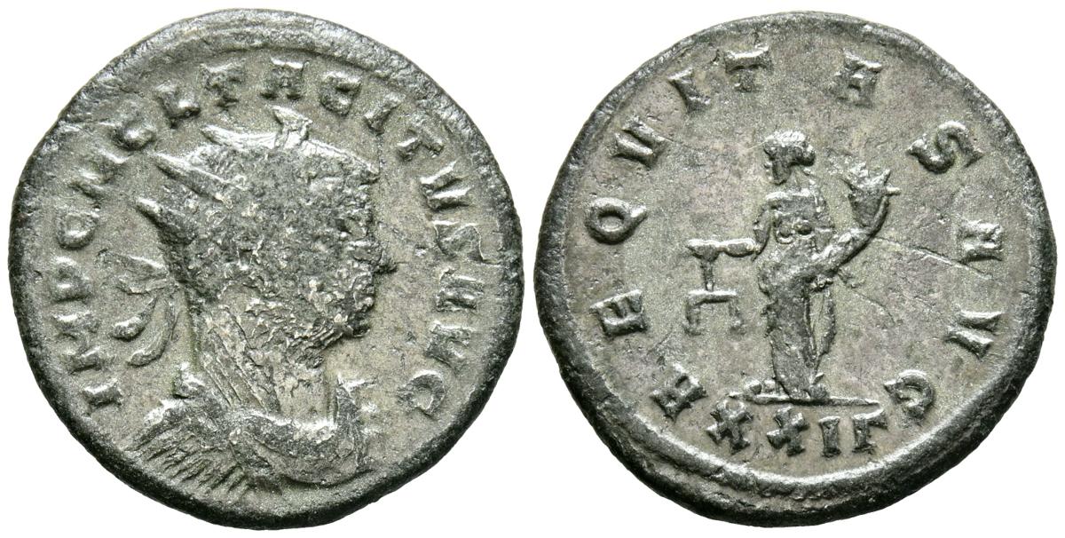 TACITO. Antoniniano. (Ae. 3,31g/22mm). 275 d.C. Roma. (RIC 82). Anv: Busto radiado y drapeado de Tácito a derecha, alrededor leyenda: IMP C M CL TACITVS AVG. Rev: Aequitas estante a izquierda portando cornucopia y escala, en exergo: XXIr, alrededor leyenda: AEQVITAS AVG. MBC.