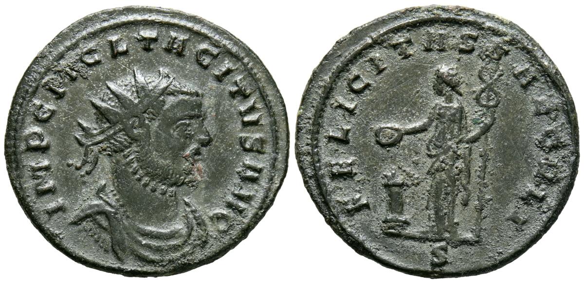TACITO. Antoniniano. (Ae. 3,45/22mm). 276 d.C. Ticinum. (RIC 138). Anv: Busto radiado y con coraza de Tácito a derecha, alrededor leyenda: IMP C M CL TACITVS AVG. Rev: Felicitas estante a izquierda portando cetro y patera sobre altar, en exergo: S, alrededor leyenda: FELICITAS SACECVLI. MBC-.