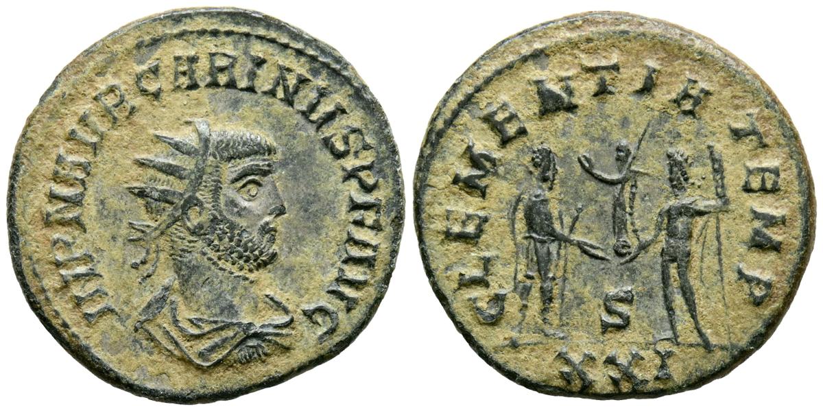 CARINO. Antoniniano. (Ae. 3,56g/21mm). 283-285 d.C. Cícico. (RIC 324). Anv: Busto radiado y drapeado de Carino a derecha, alrededor leyenda: IMP C M AVR CARINVS P F AVG. Rev: Carino estante a derecha portando lanza y recibiendo Victoria con corona de laurel de Júpiter estante a izquierda con cetro, entre ellos S, en exergo: XXI, alrededor leyenda: CLEMENTIA TEMP. MBC.
