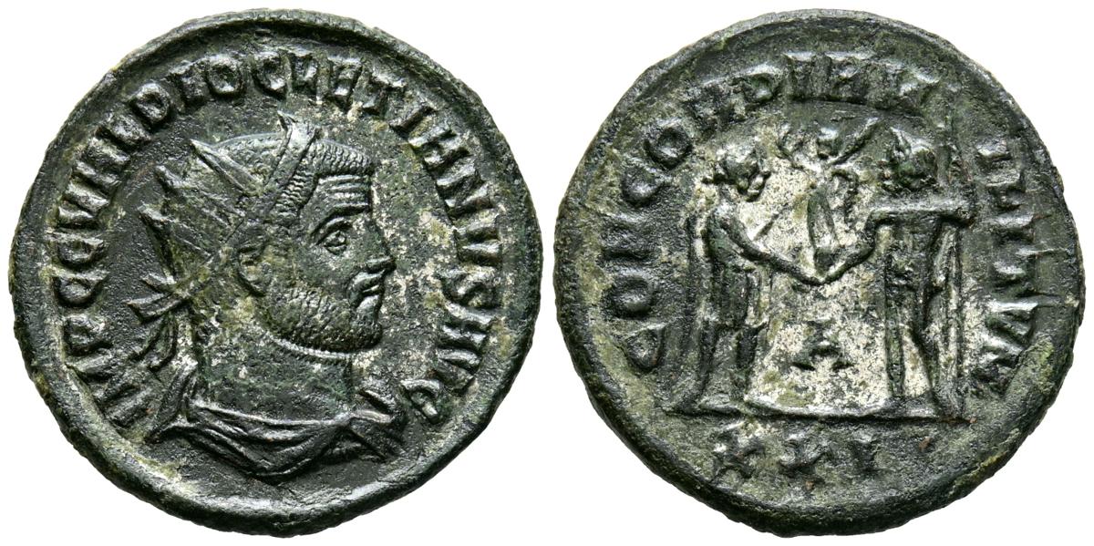 DIOCLECIANO. Antoniniano. (Ae. 4,50g/21mm). 284-294 d.C. Cícico. (RIC 306). Anv: Busto radiado, drapeado y con coraza de Diocleciano a derecha, alrededor leyenda: IMP C C VAL DIOCLETIANVS AVG. Rev: Diocleciano estante a derecha recibiendo Victoria con corona de laurel de Júpiter estante a izquierda con cetro, entre ellos A, en exergo: XXI, alrededor leyenda: CONCORDIA MILITVM. MBC. Restos de plateado original.