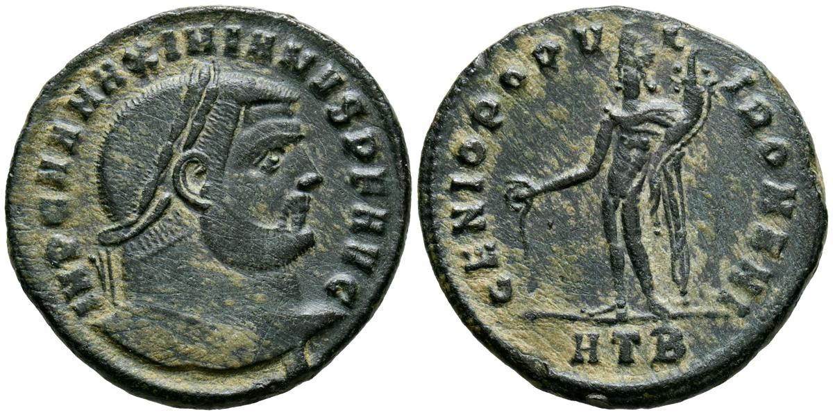 MAXIMIANO HERCULEO. Follis. (Ae. 10,31g/28mm). 286-305 d.C. Heráclea. (RIC 19a). Anv: Cabeza laureada de Maximiano Herculéo a derecha, alrededor leyenda: IMP C A MAXIMIANVS P F AVG. Rev: Genio estante a izquierda portando patera y cornucopia, en exergo: HTB, alrededor leyenda: GENIO POPVLI ROMANI. MBC.
