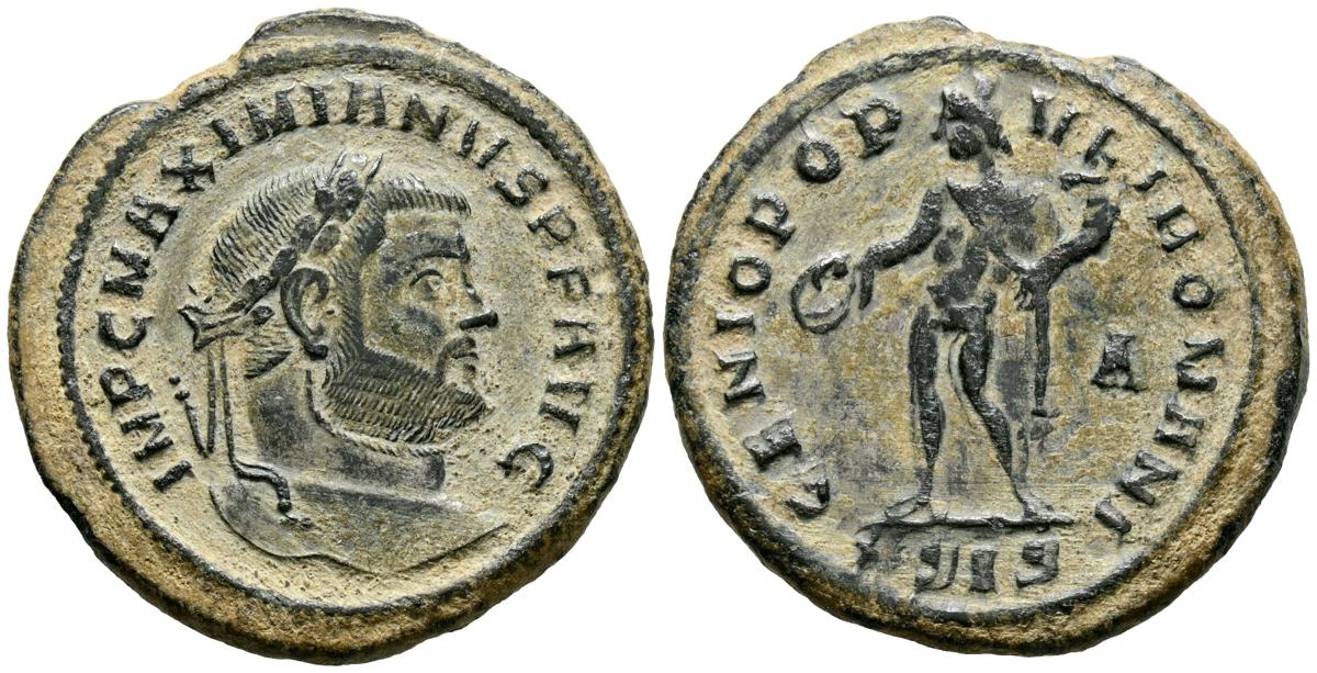 MAXIMIANO HERCULEO. Follis. (Ae. 10,51g/29mm). 295 d.C. Siscia. (RIC 85b). Anv: Cabeza laureada de Maximiano Herculeo a derecha, alrededor leyenda: IMP C MAXIMIANVS P F AVG. Rev: Genio estante a izquierda portando patera y cornucopia, en exergo: SIS, alrededor leyenda: GENIO POPVLI ROMANI. MBC.