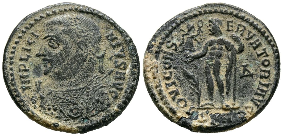 LICINIO I. Follis. (Ae. 3,29g/20mm). 308-324 d.C. Nicomedia. (RIC 24). Anv: Busto laureado y con coraza de Licinio I a izquierda portando mappa, globo y cetro, en campo A, en exergo: SMNB, alrededor leyenda: IOVI CONSERVATORI AVG. MBC.