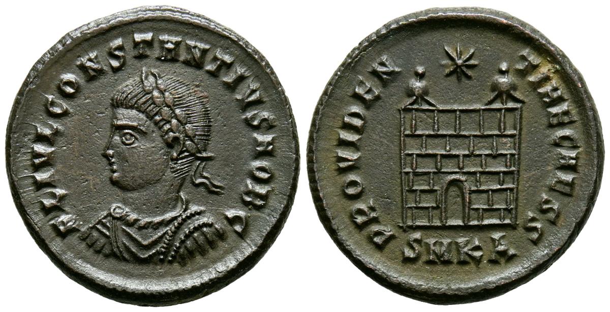 CONSTANTINO II. Follis. (Ae. 3,12g/19mm). 324-325 d.C. Cícico. (RIC 26). Anv: Busto laureado y con coraza de Constantino II a izquierda, alrededor leyenda: CONSTANTINVS IVN NOB C. Rev: Puerta de campamento, encima estrella entre dos torretas, debajo: SMKA, alrededor leyenda: PROVIDENTIAE CAESS. EBC.