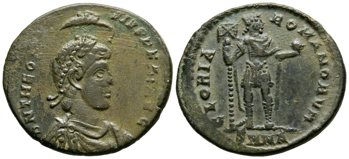 TEODOSIO I. Nummus. (Ae. 4,32g/23mm). 392-394 d.C. Nicomedia. (RIC 46). Anv: Busto diademado y drapeado de Teodosio I, alrededor leyenda: D N THEODOSIVS P F AVG. Rev: Teodosio I estante a derecha portando estandarte y globo, en exergo: SMNA, alrededor leyenda: GLORIA ROMANORVM. MBC-.