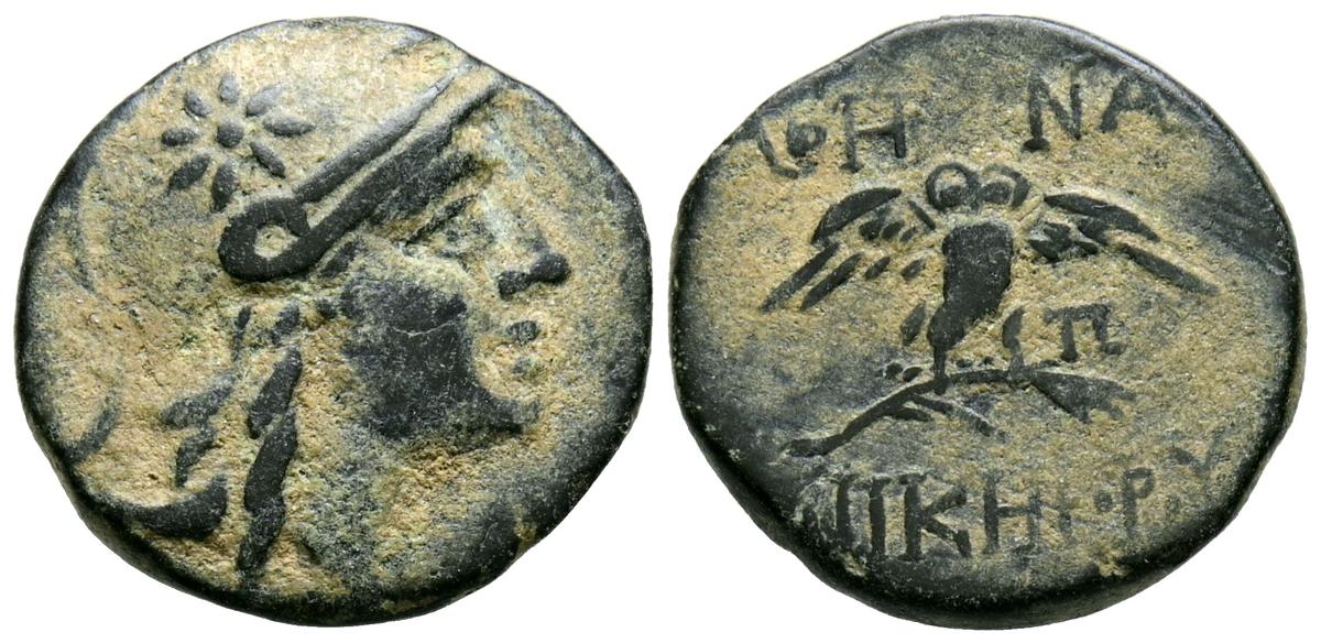 MISIA, Pérgamo. Ae11. (Ae. 2,25g/11mm). 200-133 a.C. (SNG BN 1905-26). Anv: Cabeza de Atenas con casco a derecha. Rev: Búho con las alas extendidas de frente sobre palma, alrededor leyenda griega, en campo letra griega. MBC.