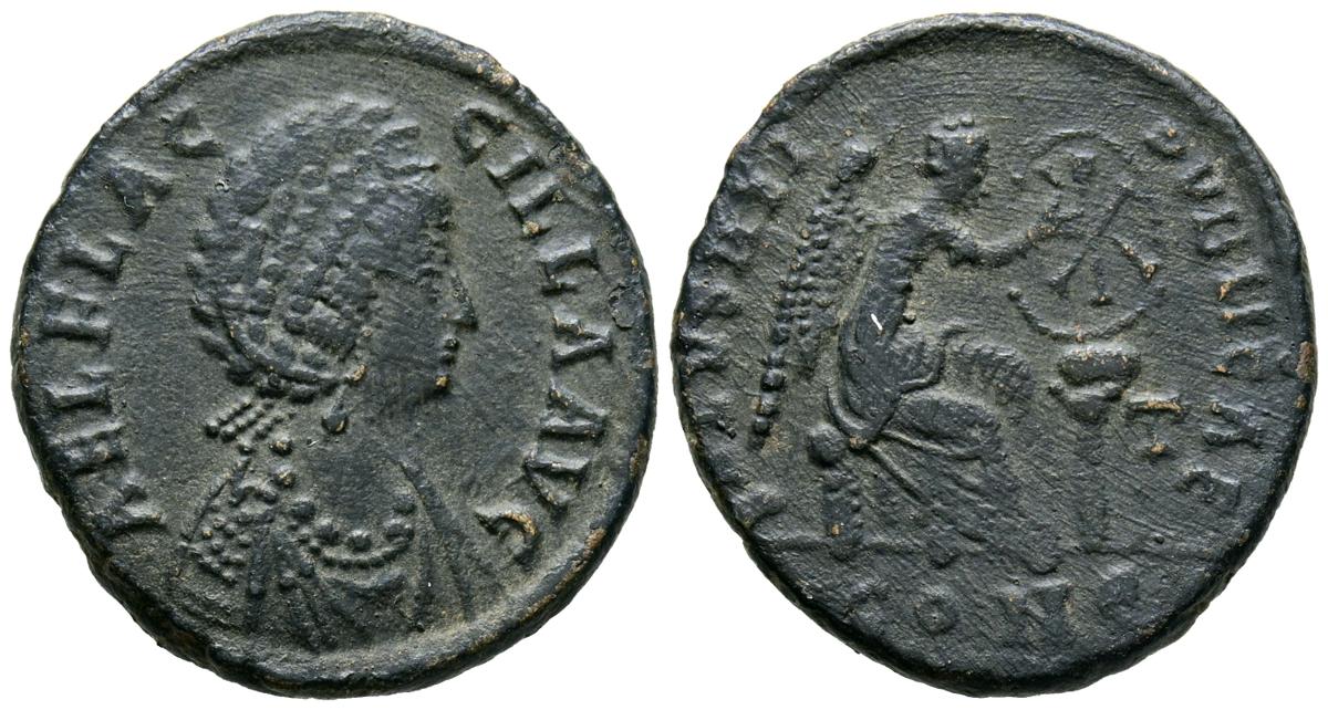 AELIA FLACILLA. Follis. (Ae. 5,54g/17mm). 379-388 d.C. Constatinopla. (RIC 81). Anv: Busto diademado y drapeado de Aelia Flacilla a derecha, alrededor leyenda: AEL FLACCILLA AVG. Rev: Victoria sentada a derecha, delante escudo con cristograma sobre columna, en exergo: CONS, alrededor leyenda: SALVS REI PVBLICAE. MBC.