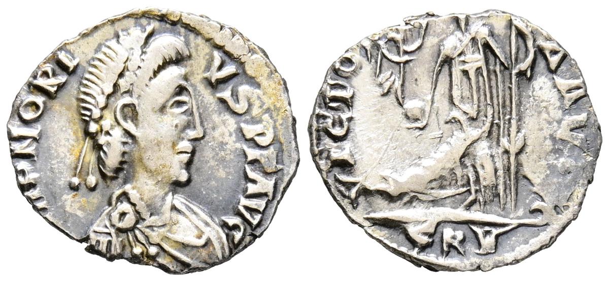 HONORIO. 1/2 Silicua de imitación visigoda. (Ar. 1,01g/14mm). 415 d.C. Ceca incierta, imitando a Rávena. (RIC 3703). Anv: Busto drapeado y diademado de Honorio a derecha, alrededor leyenda: D N HONORIVS P F AVG. Rev: Roma sentada a izquierda portanod lanza y Victoria con corona de laurel, en exergo: PSRV, alrededor leyenda: VICTORIA AVGG. MBC. Limpiado. Escaso.