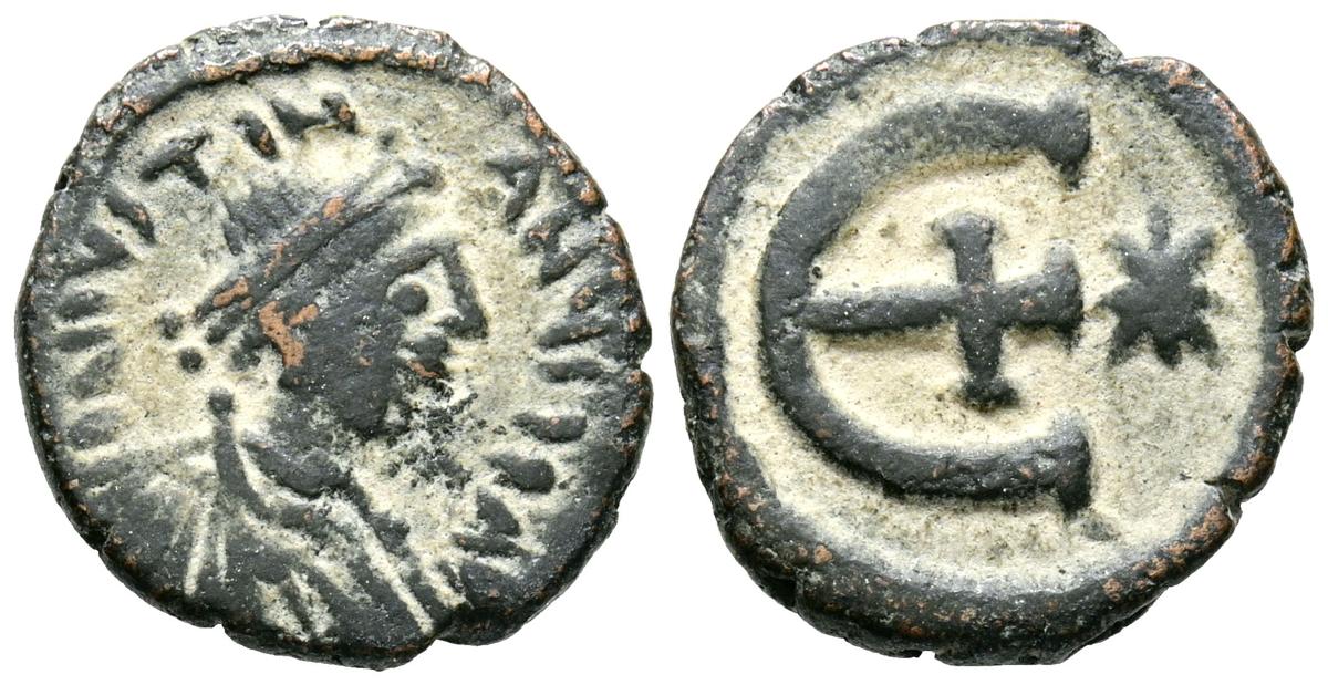 JUSTINIANO I. Pentanummium. (Ae. 1,81g/15mm). 551-560 d.C. Antioquía. (Seaby 244). Anv: Busto laureado y con coraza de Justiniano I a derecha, alrededor leyenda. Rev: Monograma, delante estrella. MBC-.